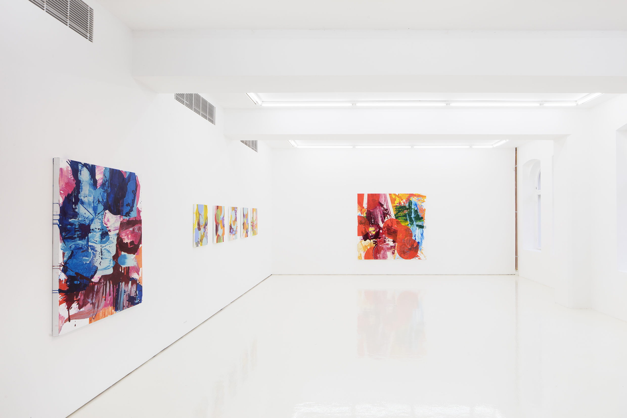 The name of the exhibition refers to catching a volatile feeling, which is how Sylwan experiences painting. To Sylwan, painting is about being in the present and constantly rejecting what you think you know. A painting by the same name, Dagen fick en annan ton, creates a backdrop to the exhibition. The work came to be in the beginning of this working process, it is confident and strong, and a prime example of Sylwan’s use of colours and paint