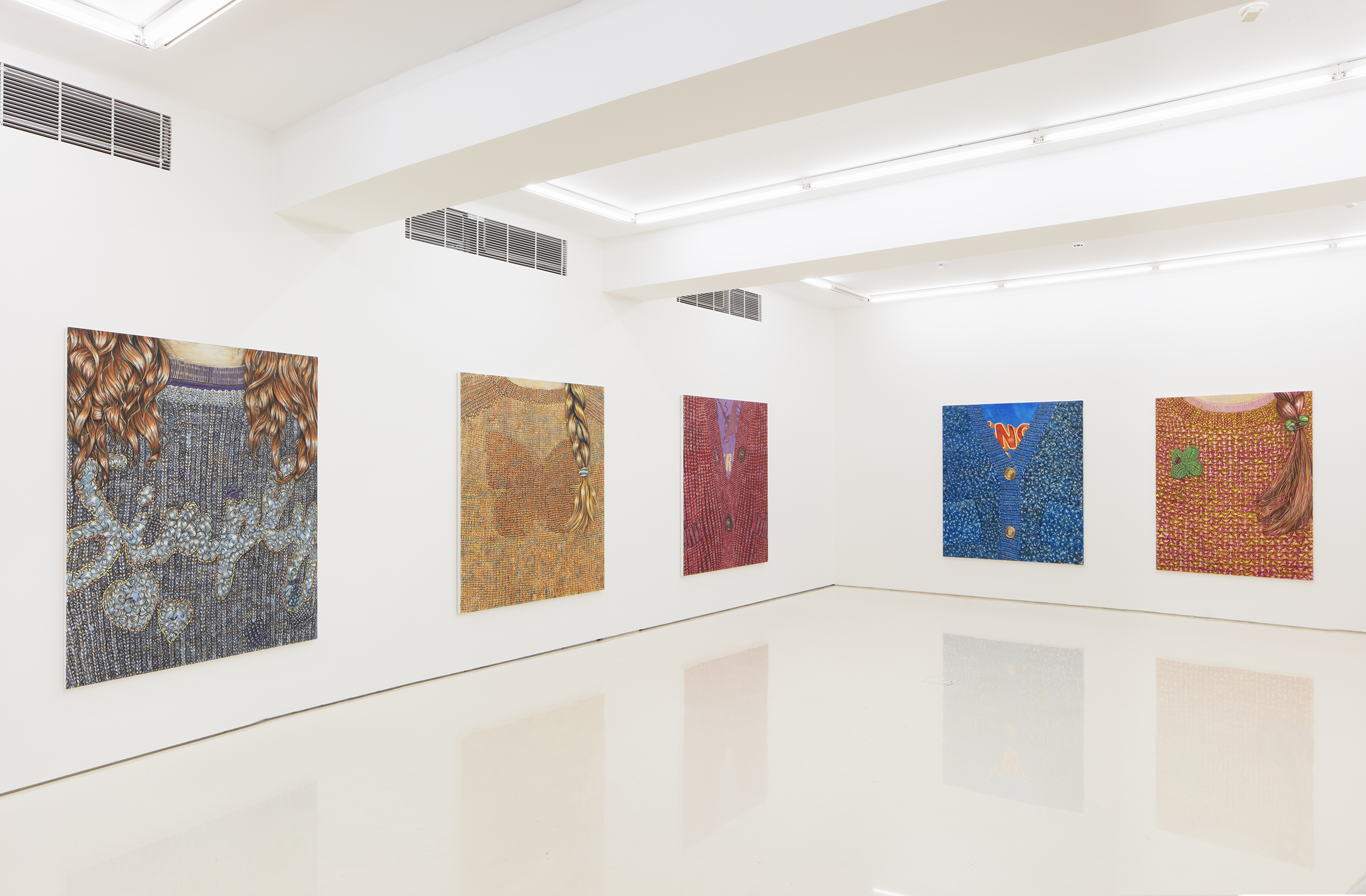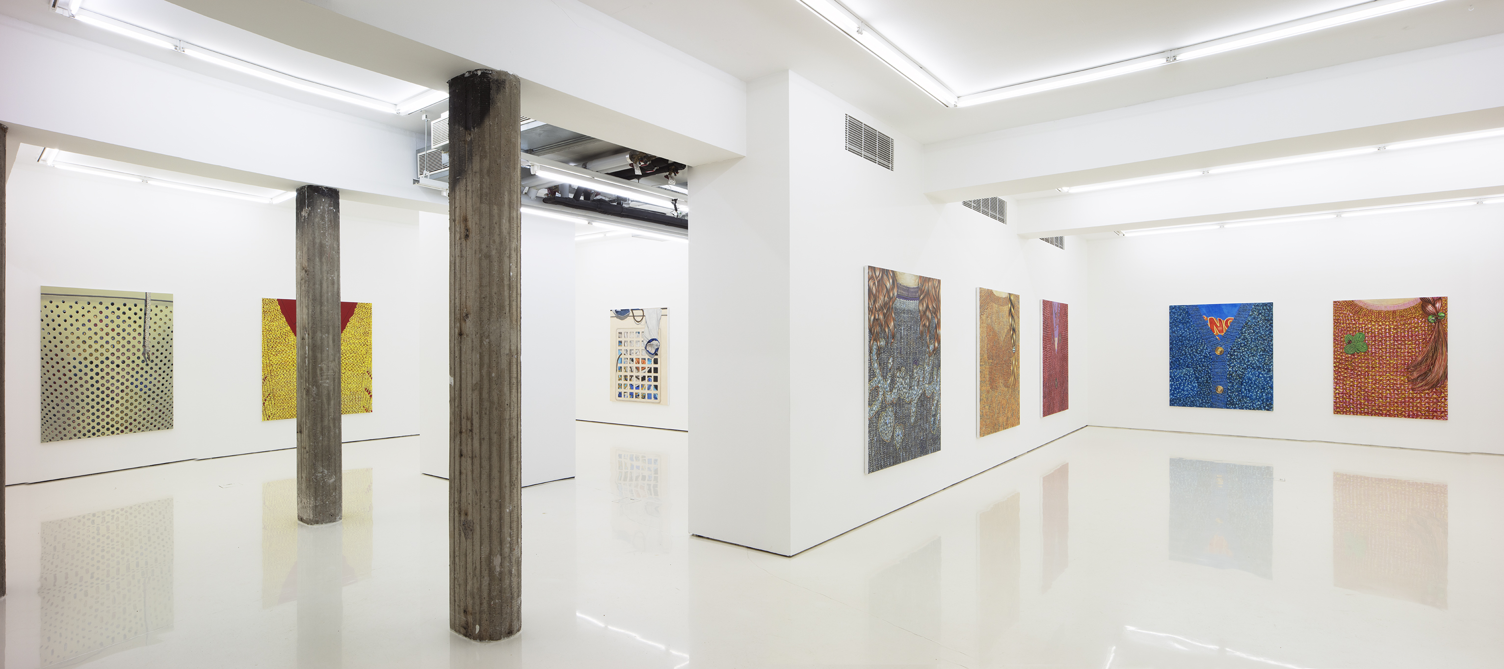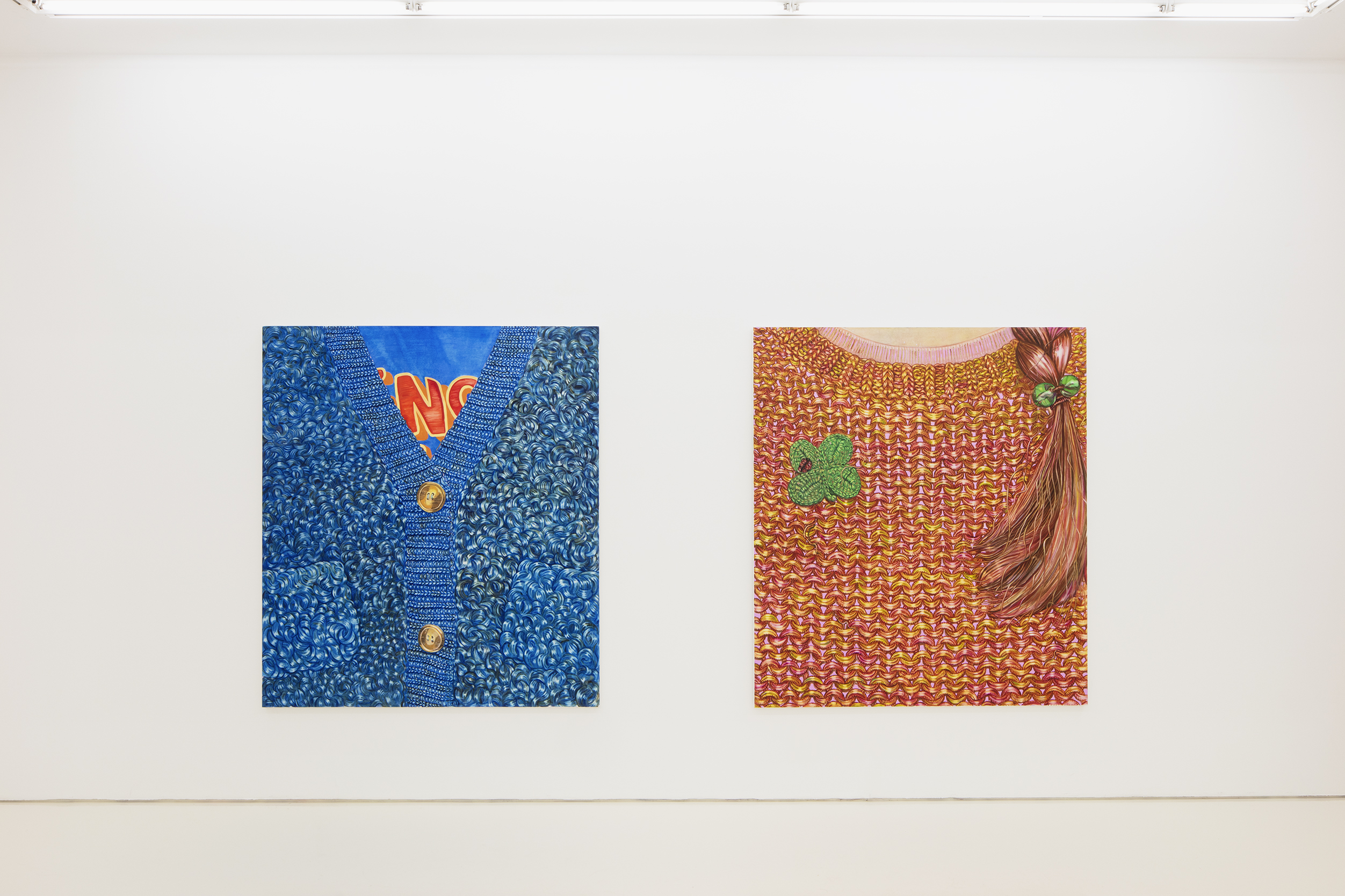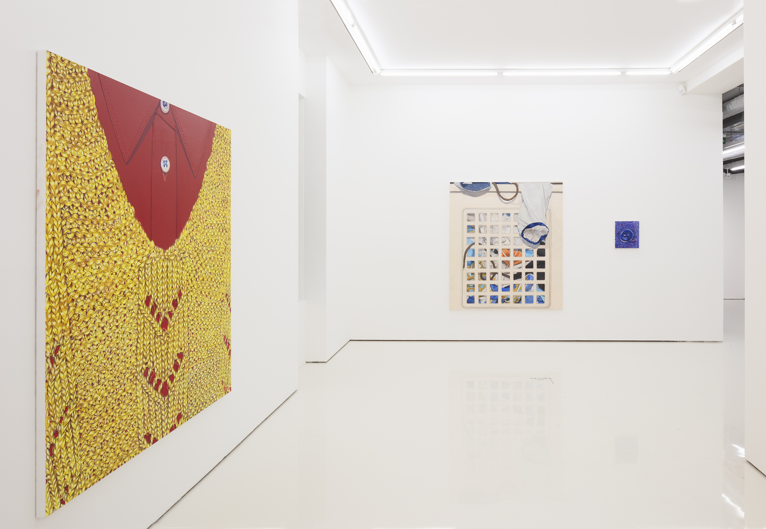 Nio’s complexly layered paintings straddle between abstraction and representation. Things hidden behind façades are central to her recent paintings, many of which literally contain peepholes evoking the duality of daily existence: behind the public façade is a private world that is revealed only to one’s closest loved ones. Fluffy jumpers and other items of clothing appear as recurring symbols of the softening buffers that we erect between ourselves and external reality.
