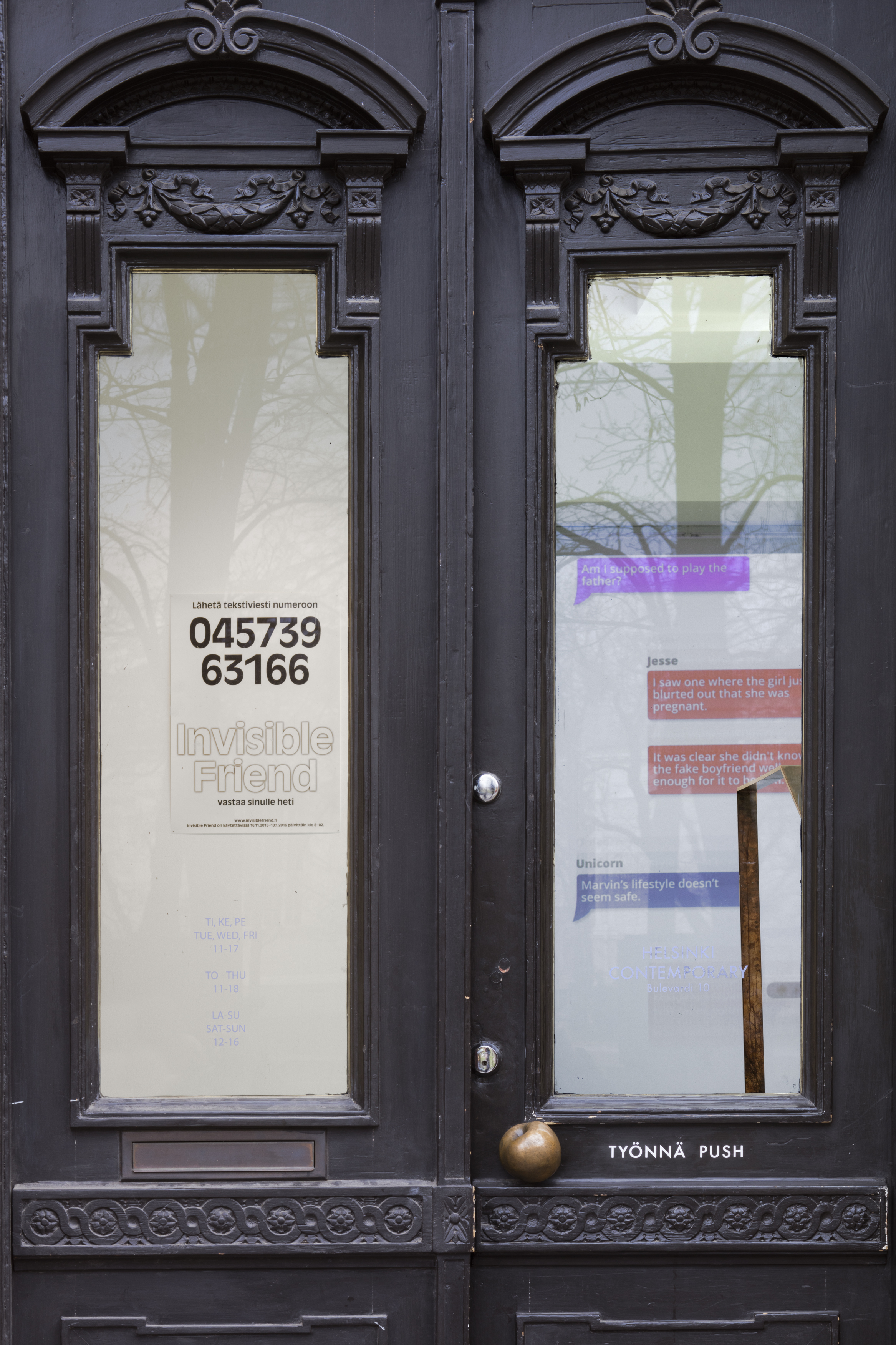 The idea for Invisible Friend came from Takala’s experience in working at a text message service in the US, where the users pay for having a pretend girlfriend or boyfriend texting them. Takala was fascinated by the potential in the fictional space created in the text message exchange, but like many of the other workers, she was frustrated by the inconsistencies and lack of quality in the existing service. The video at the back of the gallery is based on conversations on a discussion forum between the writers working at this US service, trying to figure out together how to be an invisible partner.