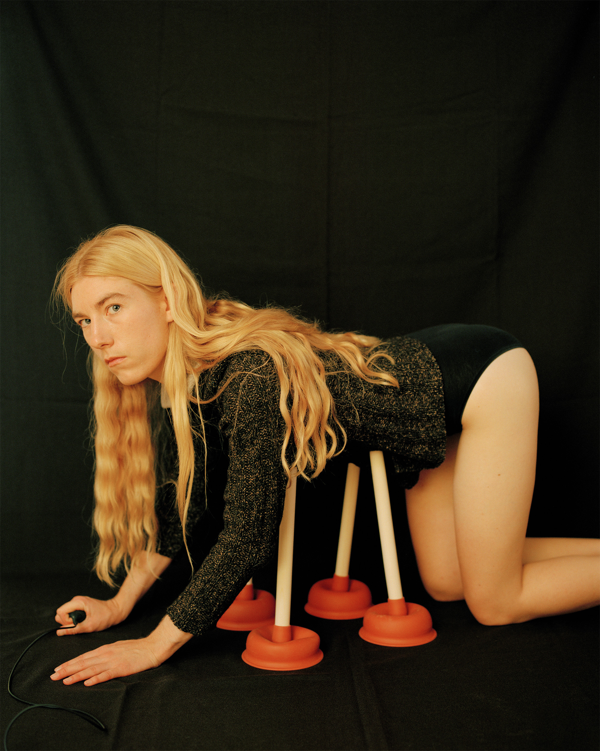 Emma Sarpaniemi’s solo exhibition examines identity and gender roles through performative self-portraits. The artist performs various models of femininity based on symbols of innocence and absurdity, testing the limits of self-representation. The photographs are created through bodily performances, reactions to phallocentric objects such as a baguette, a pencil or a rolling pin. The artist translates the act of taking control of one’s own image into a playful and humorous self-reflection.