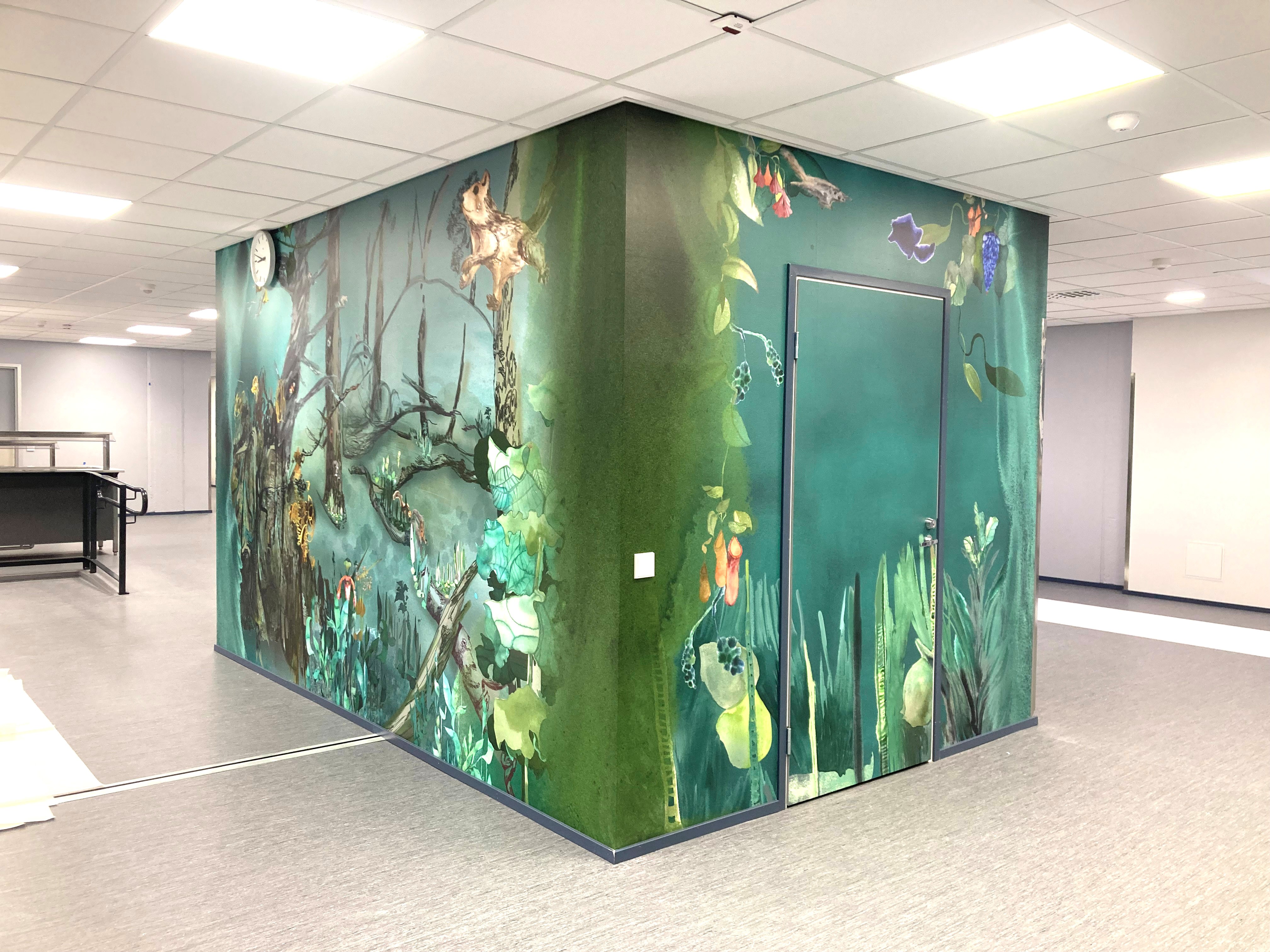 The work consists of an art wallpaper in the dining hall, sticker prints attached to the glass surfaces in the classrooms, an animation, watercolor paintings on birch plywood, and a poetry book that Immonen created in collaboration with the school's students and author Emilia Lehtinen.
