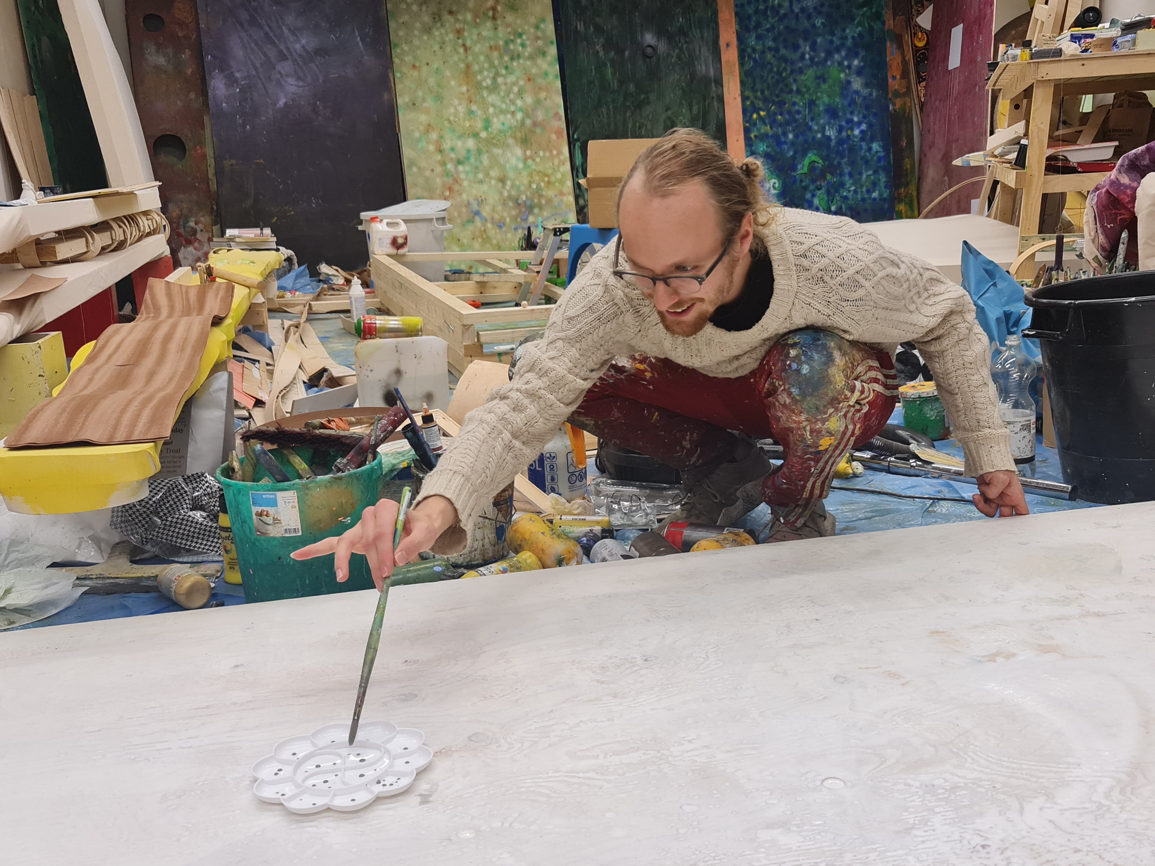 Lasse Juuti works in a large scale, pondering the possibilities of painting, as well as its relationship with the space and body. Through play and intuition, Juuti’s work is buildt into more precise observations. Juuti approaches his subjects by combining painting, collage, and three-dimensional assemblages, that are refined into ever new poetic images by alienating the familiar and ordinary. The paintings, sculptures and hybrids of thereof are built from a variety of themes and subjects, relying on colours, materials and their encounters. By taking a stand on the built space, the artist’s works create a uniform narrative across different surfaces.