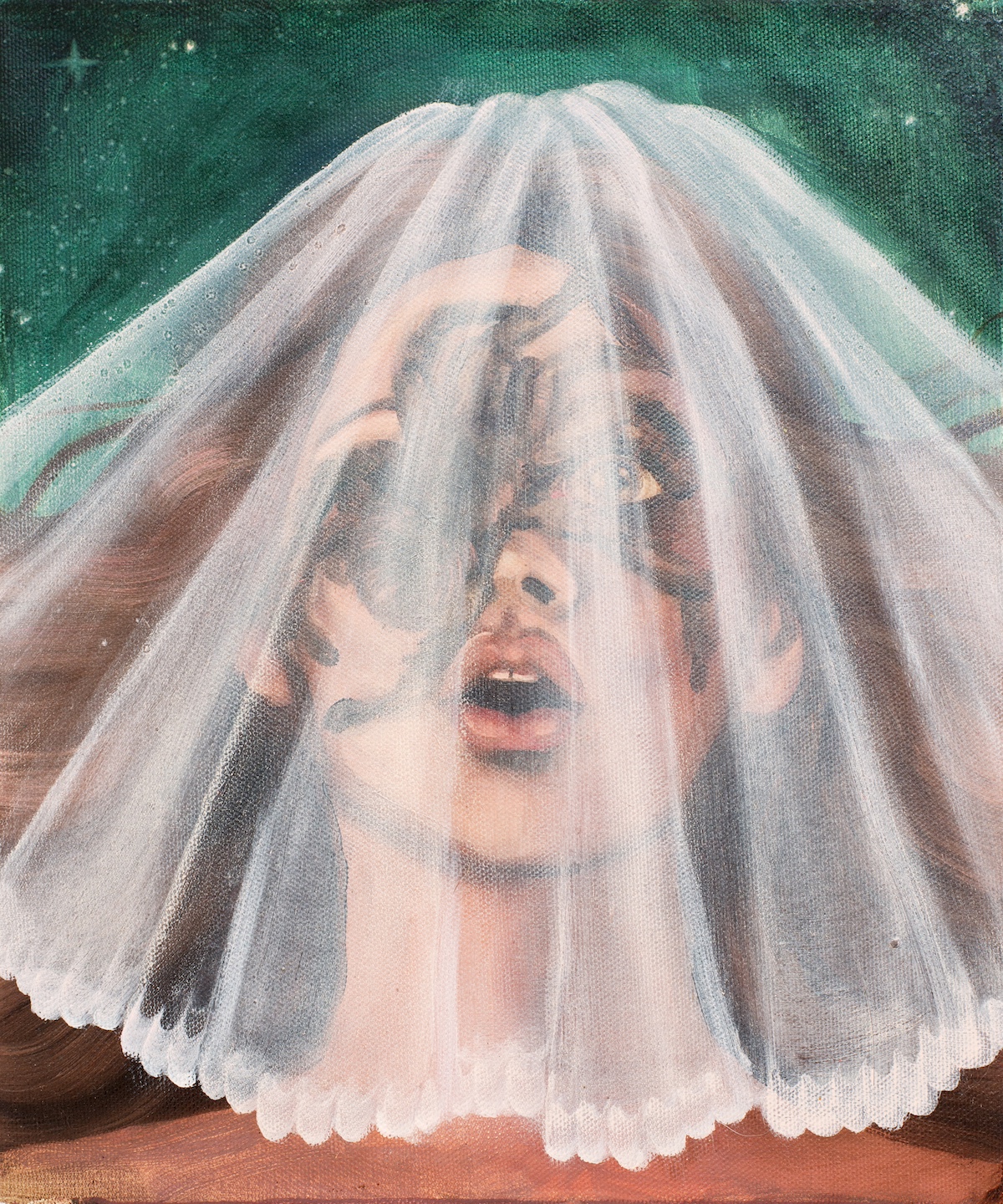 Womanhood and girlhood are long-standing themes in Ainala’s oeuvre. The figures in her latest paintings are portrayed in princess-like gowns and wedding veils, sometimes blending in with the ornate interiors. The figure’s gaze is usually averted or her eyes are closed, or the head and eyes might be absent altogether. Bridal gowns and veils are trappings associated with the new #bridalcore fashion trend that is on the rise on social media.