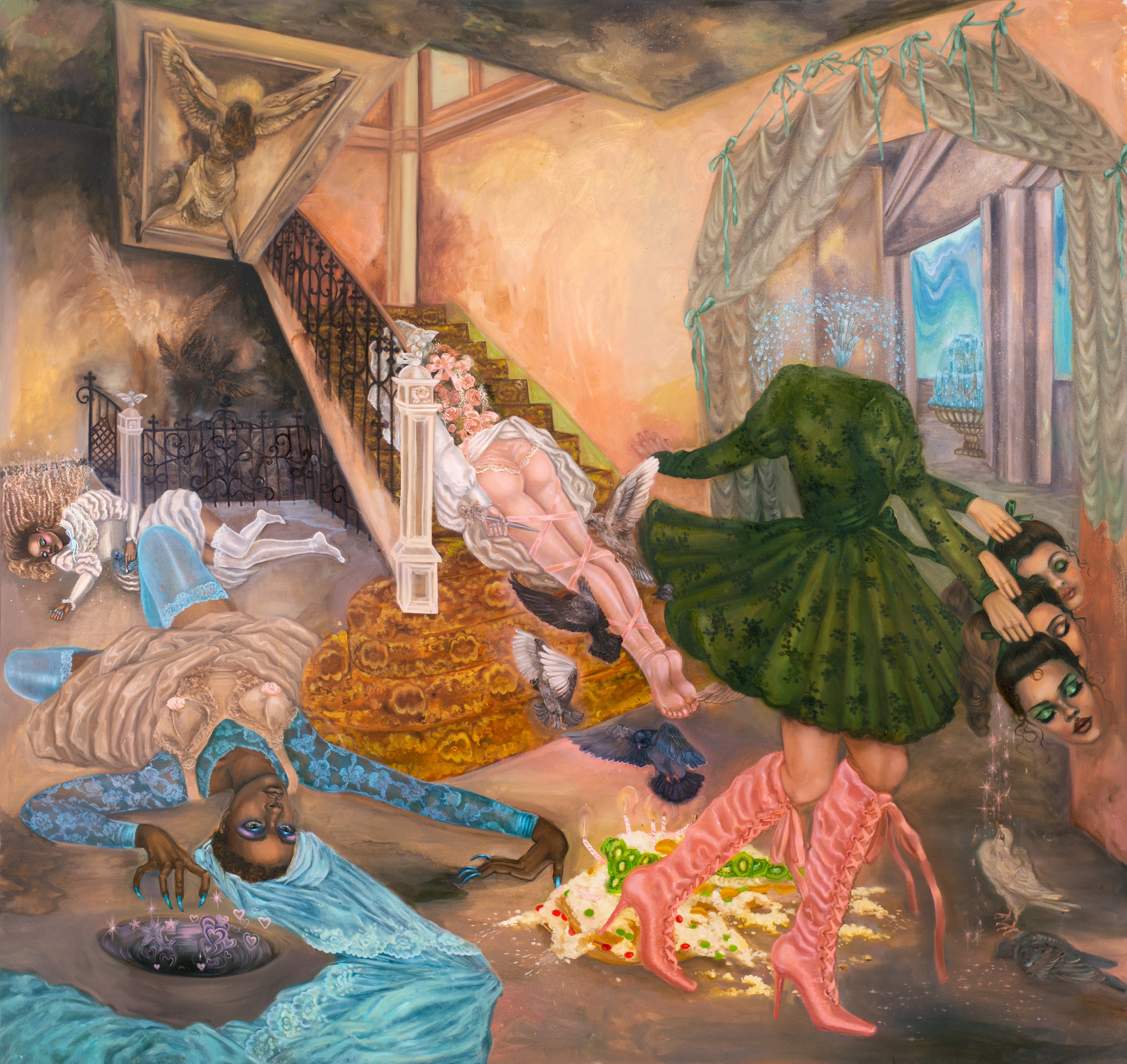 Ainala’s latest paintings depict lavish, manor-like interiors inhabited by female figures that are hybridized with mythical creatures. It remains for the viewer to interpret whether we are looking at “dreams come true”, fantasy scenes, role play, or nightmares.