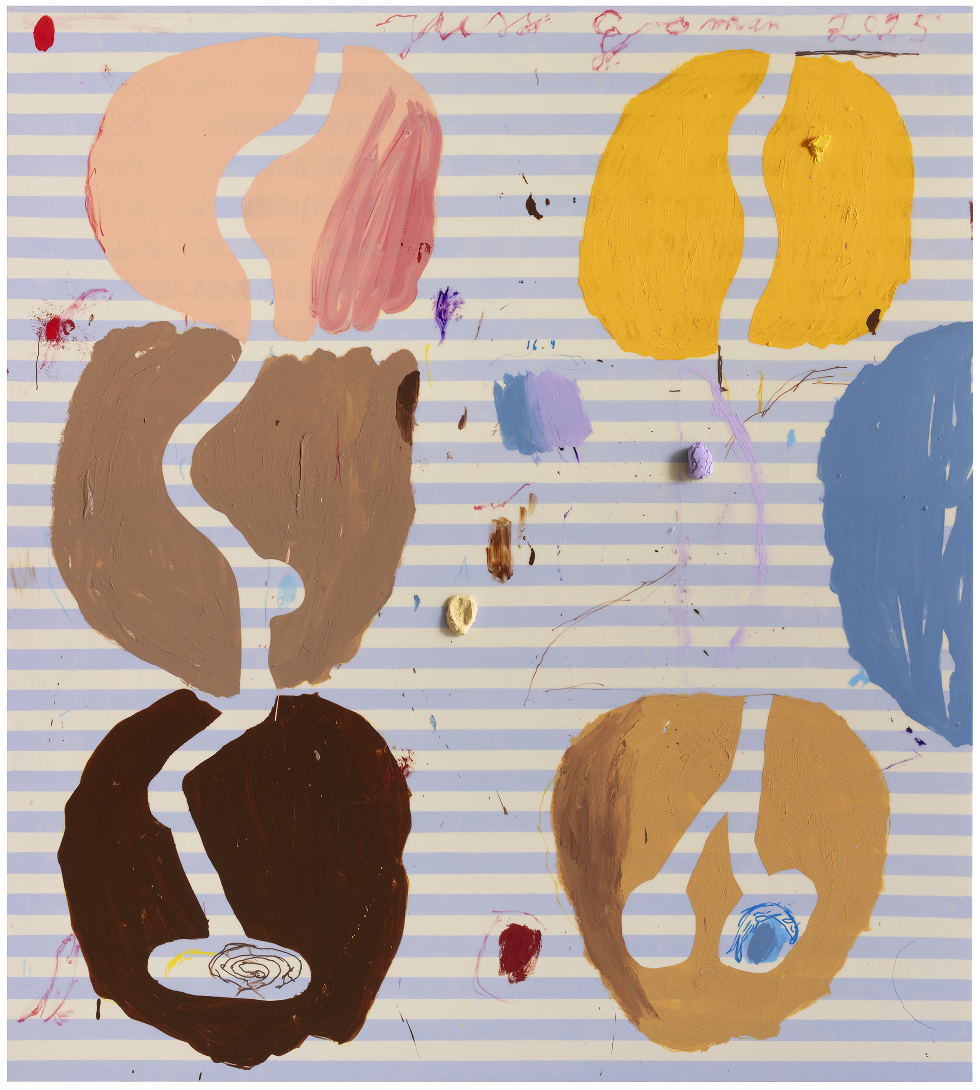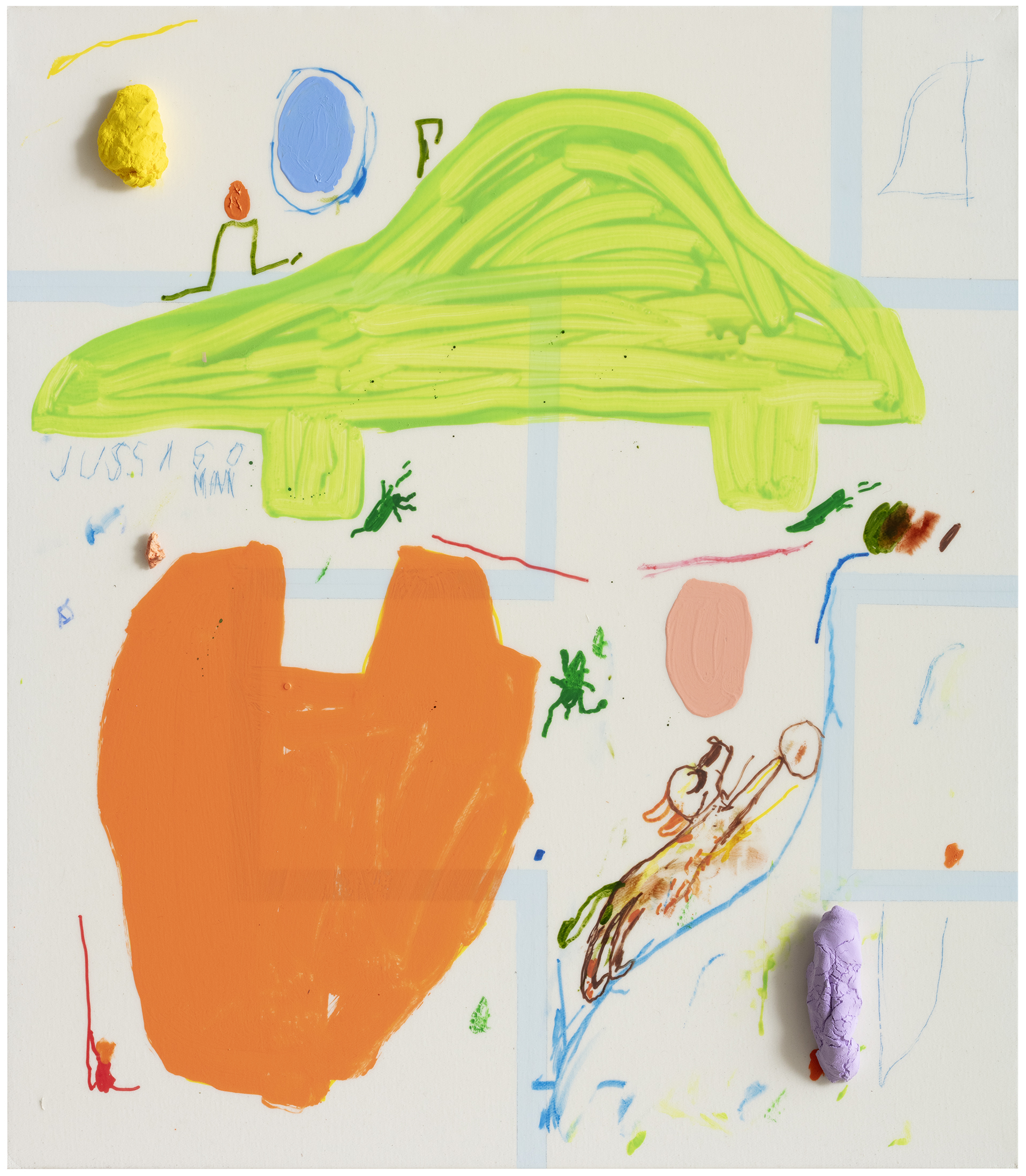 Jussi Goman’s new paintings feature colour-drenched layers of paint that carve out unruly paths upon an orderly configuration of grids and lines. The resultant pattern is reminiscent of doodles in a graph notebook, a jigsaw puzzle, a Snake video game, or the Minotaur’s labyrinth, invoking spontaneous shortcuts, dead ends, and myriad narratives.