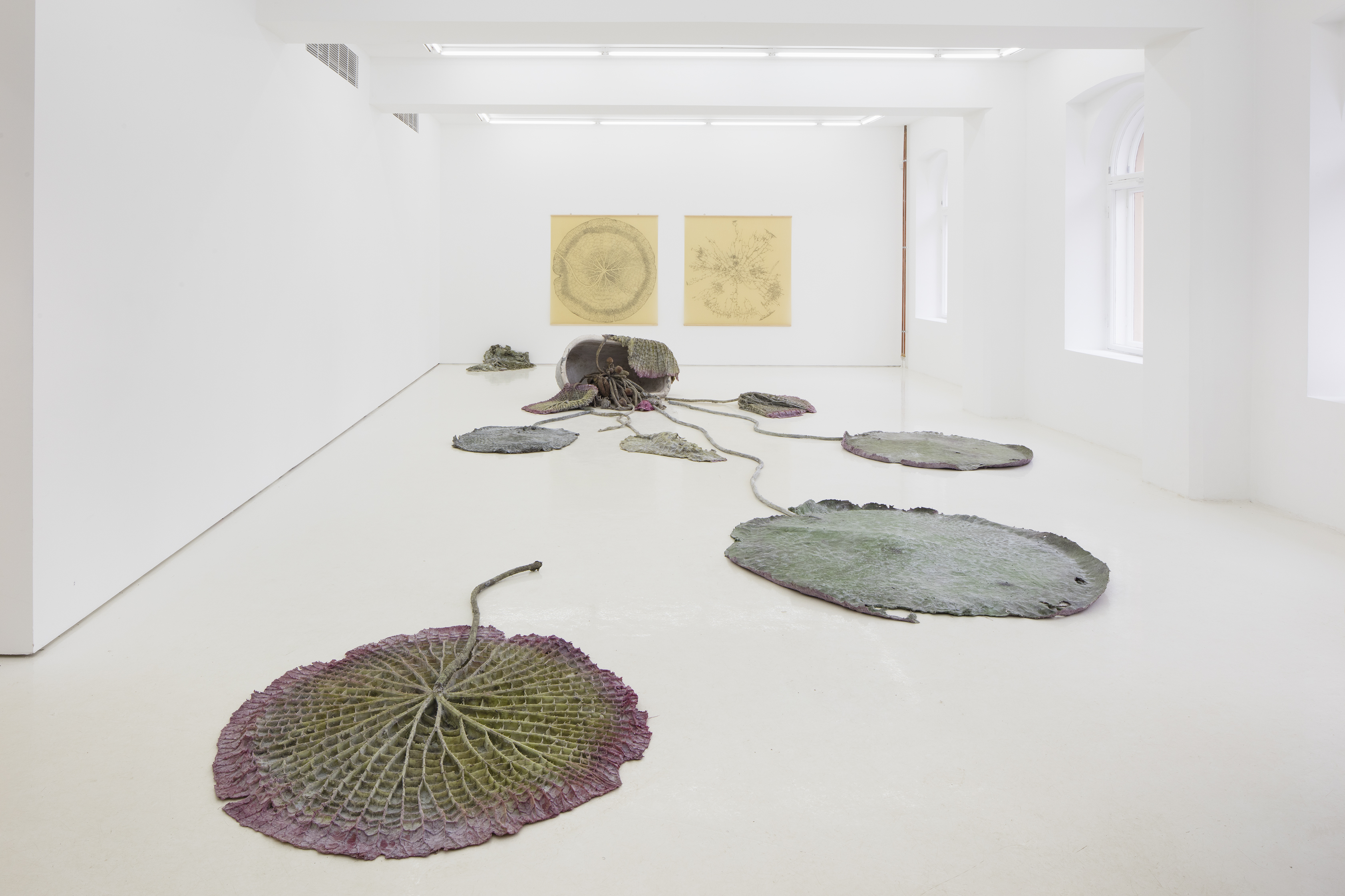 The exhibition includes a series of large, plant-motif drawings that resemble botanical illustrations. Countless dots of ink draw the image slowly to an opaque, waxy paper as if it was tattooed to skin. Although this meditative working method balances the pervasive physical nature of his sculptures, Persson describes drawing as the starting point to all his work. Drawings are like letters for the sculptures: explanations for things we can not explain.