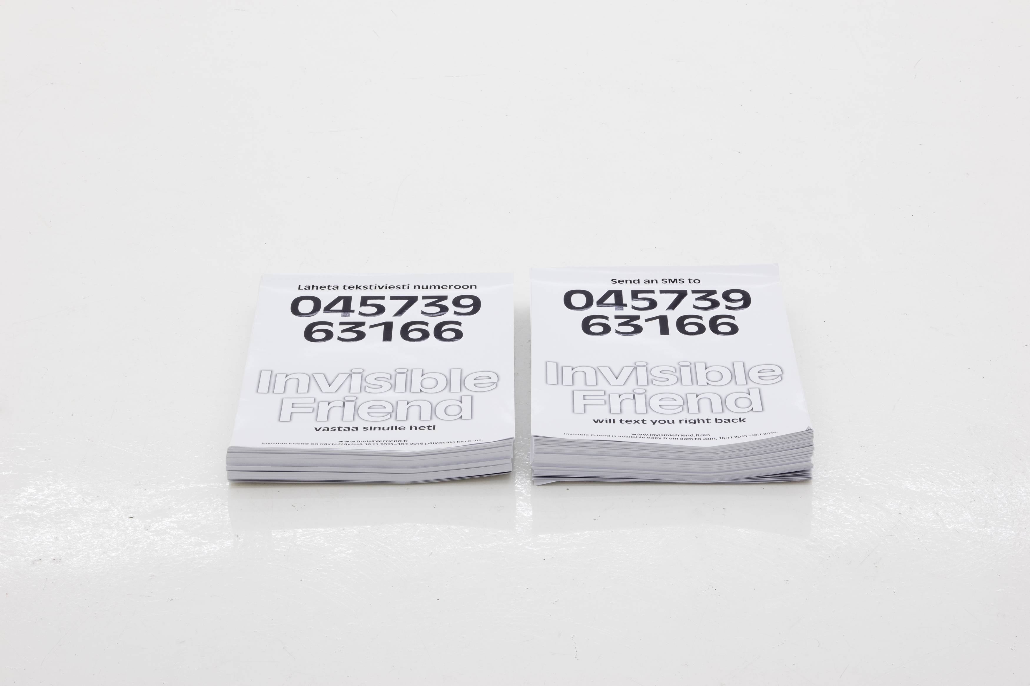 The idea for Invisible Friend came from Takala’s experience in working at a text message service in the US, where the users pay for having a pretend girlfriend or boyfriend texting them. Takala was fascinated by the potential in the fictional space created in the text message exchange, but like many of the other workers, she was frustrated by the inconsistencies and lack of quality in the existing service. The video at the back of the gallery is based on conversations on a discussion forum between the writers working at this US service, trying to figure out together how to be an invisible partner.