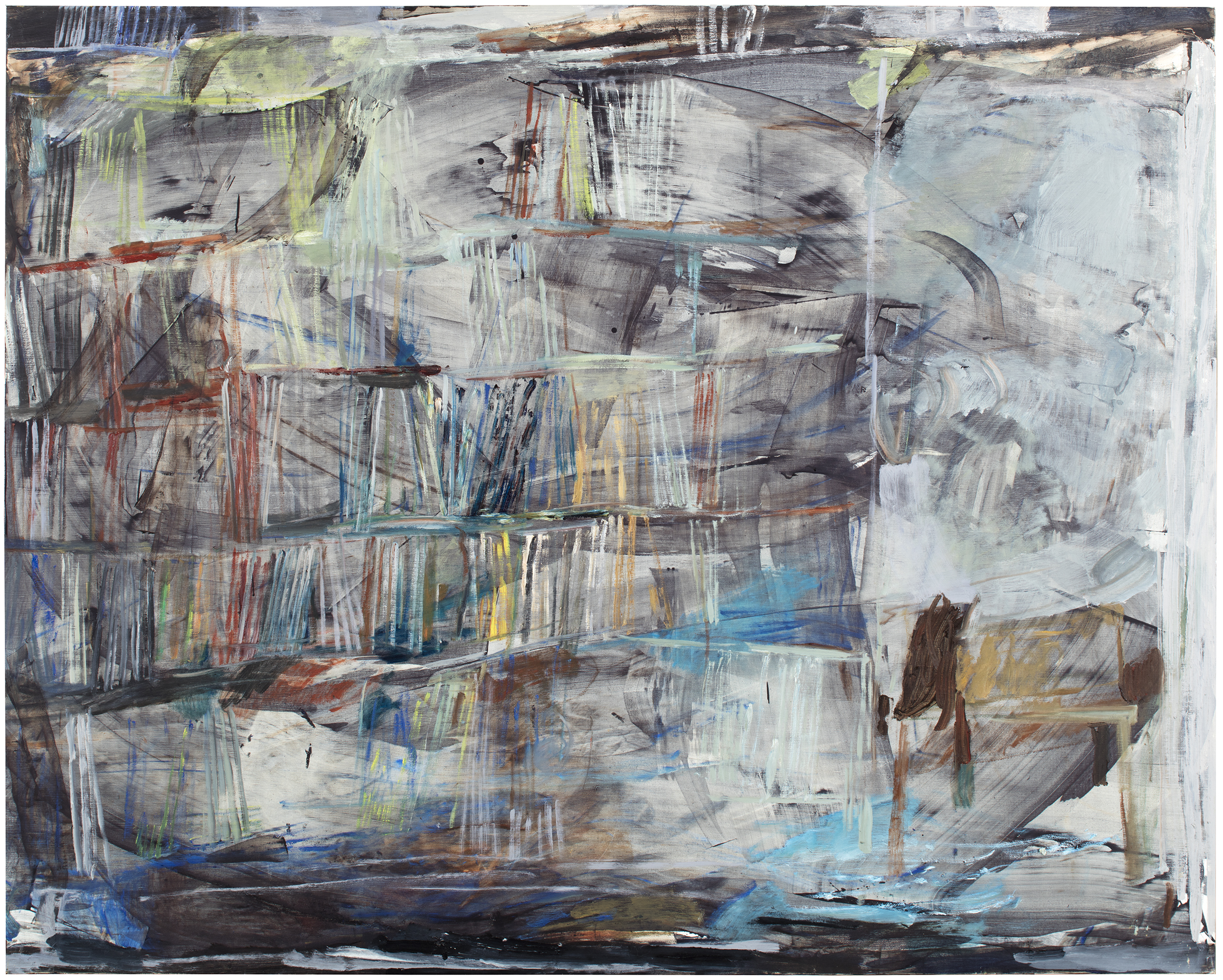 Anna Retulainen’s latest exhibition is called Encounters (Kohtaamisia). Her new series of works consists of ten paintings of equal size (160x200), which initially appear to be more or less abstract, but on closer inspection reveal themselves to be figurative works depicting various spaces. Knowing the artist’s way of working, it is evident that these spatial encounters have occurred between her and her models. The external appearance of the paintings varies, since, at times, their surface is as if covered by a monochrome gauze and, at times, the view has become clear, when the mood and content of the space seem to be revealed.