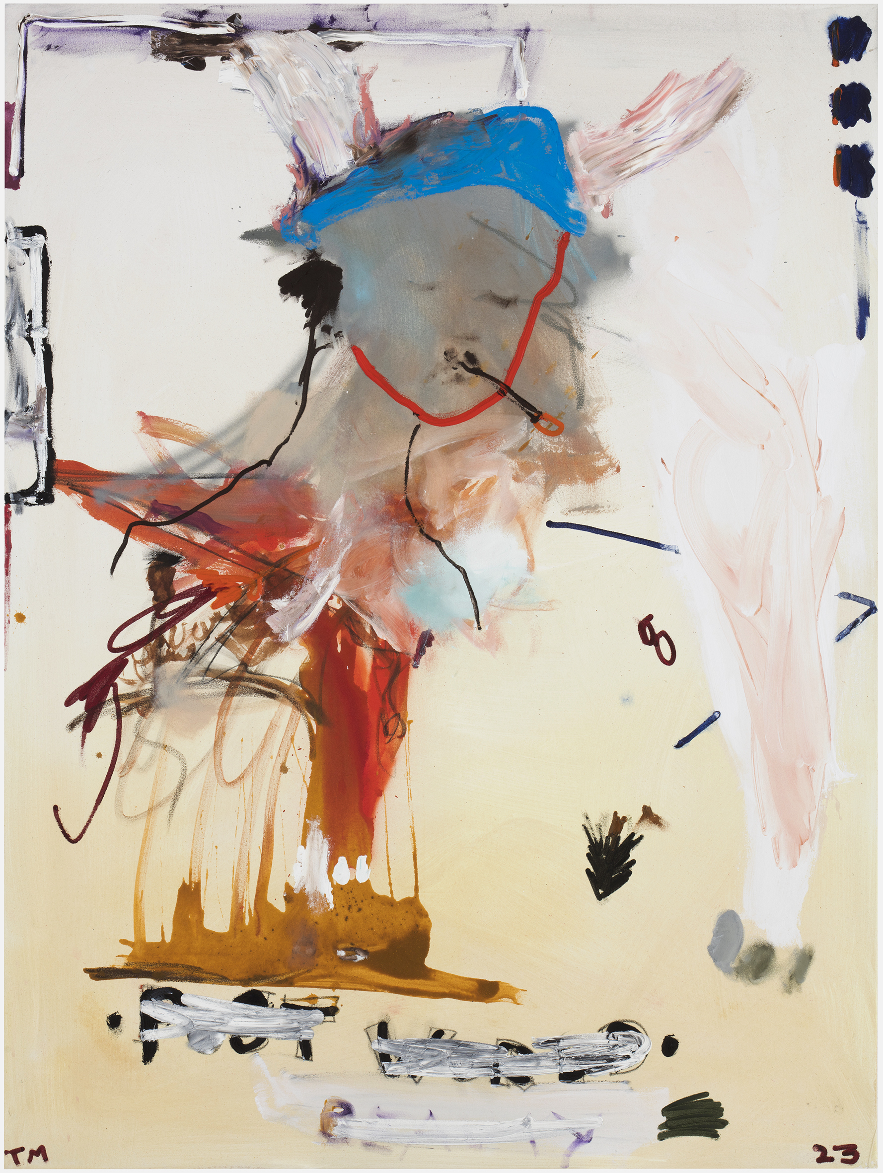Mäenpää’s creative process is intuitive, avoiding the formulaic. “I start by making gestures on the canvas, what kind depends quite a bit on my state of mind. Sometimes, the initial gestures can be so intriguing that they take me a long way. I observe the emergence of the gestures, seize coincidences, and begin seeing ideas and stories,” he says. Occasionally, he draws words on the canvas, like reminders, which guide the working process, eventually vanishing beneath layers of paint. Through the making of a painting, while working on it, a certainty arises about where and where not to act, how far to go, and when to stop.