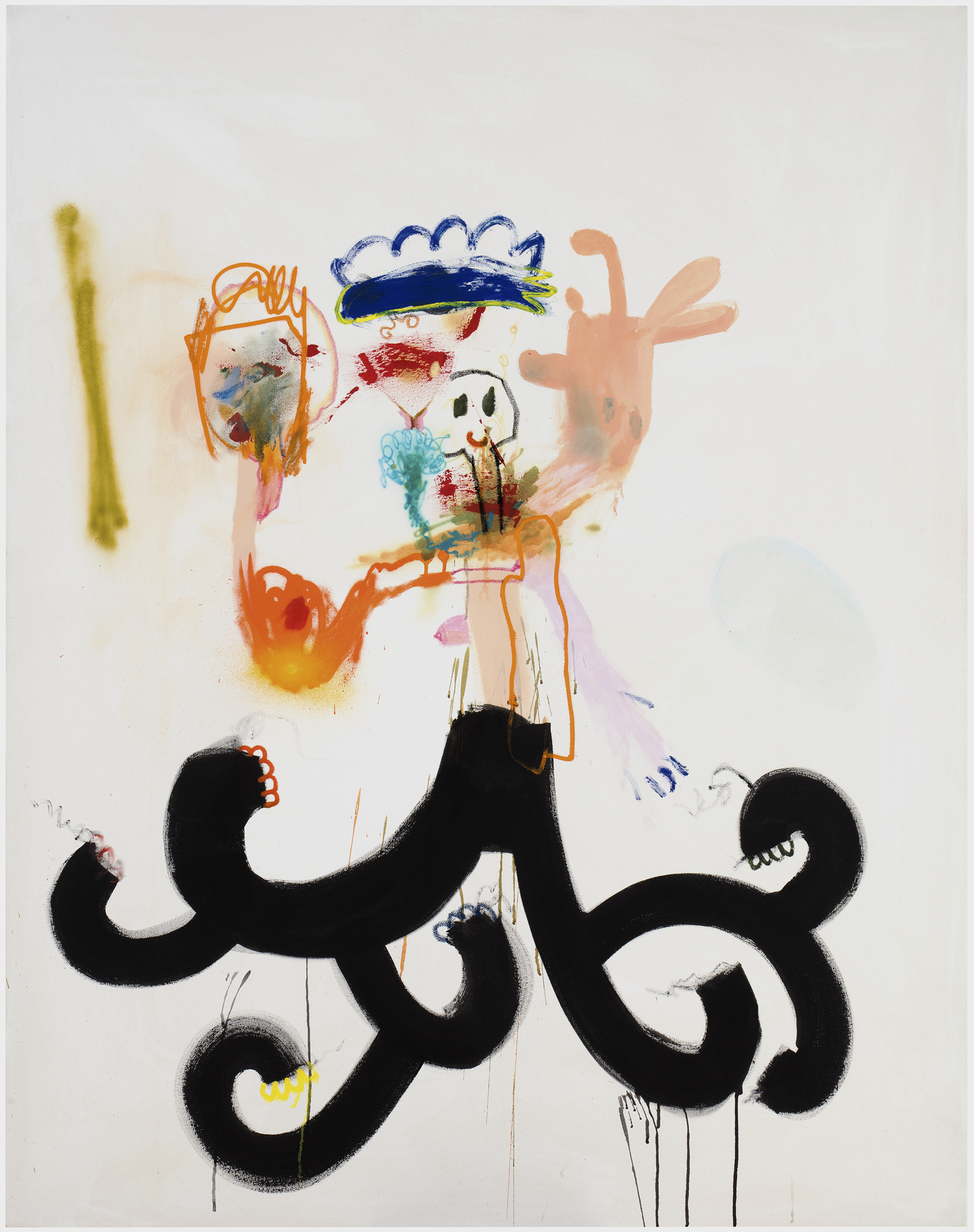 Spray-painted lines, drips and pastel drawings create contrasts on the surface of his oil paintings. Mäenpää makes open-ended use of the means of street-art to combine the disparate techniques. “I use oil pastels for their simplicity and specifically for the “honest” marks that result from drawing. I’m happy to use anything that comes to hand, as long as it serves the work.” The unconstrained use of colour and the bold approach to painting stem from Mäenpää’s background as a graffiti artist. The spontaneity and ephemerality of graffiti are still there in his spacious compositions framed by light backgrounds.