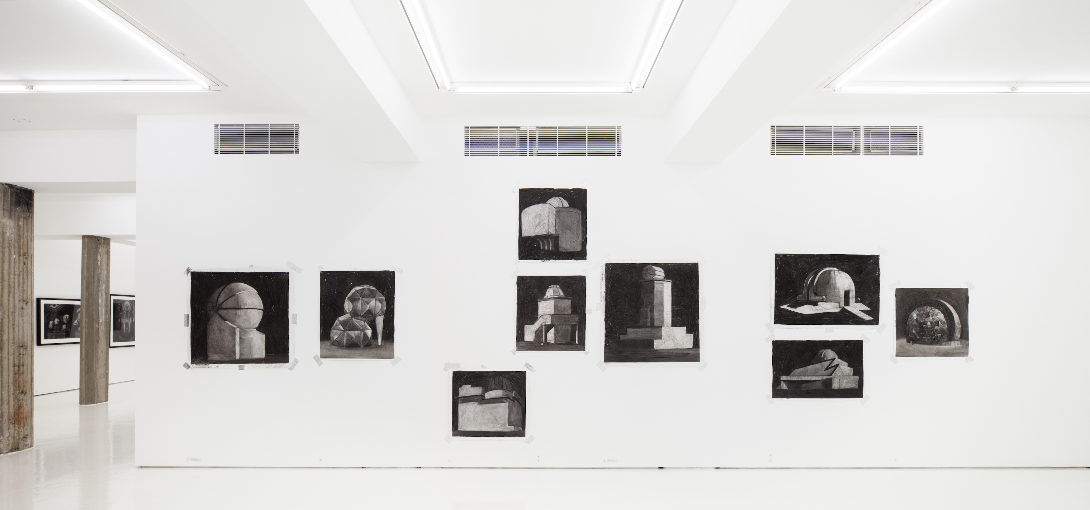 The buildings that appear in my drawings have been taken from various parts of the world and in their own way constitute a network of mechanical eyes that encircles the globe. They are like modern cathedrals in which people gaze into the unknown and into the mystery of the universe. Lone buildings surrounded by darkness.