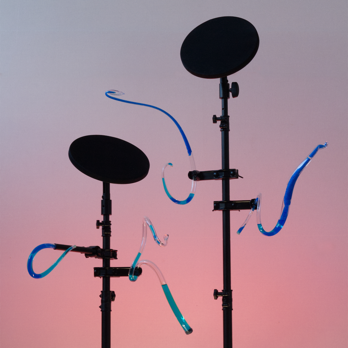 The exhibition is based on containment vats or spill pallets used for environmental protection for different industries. These containers have a particular use in storing hazardous materials and solvents, but in this context, they also refer to 1970s and 1980s science fiction sets, where a service tunnel of a spaceship (like Nostromo in Alien, 1979) might have these kinds of steel grids. On these table-like containers, there are sculptures from the series of works that Laitinen has produced for Octopuses, and a setting connected to the history and mythology of coffee. These works are all related to Laitinen’s research on shapeshifting bodies, other-than-human oceanic lifeforms, and the alteration of neurotransmitters. In a broader sense, the pieces highlight the sensual qualities of glass as biomorphic forms made with the agency of sand, gravity, and air, and also as a mediator in the history of knowledge production. Glass has made it possible to see very near and very far. In the exhibition, the material acts as a “carrier bag” container, a tear vial, an alchemical tool, and a shelter.
