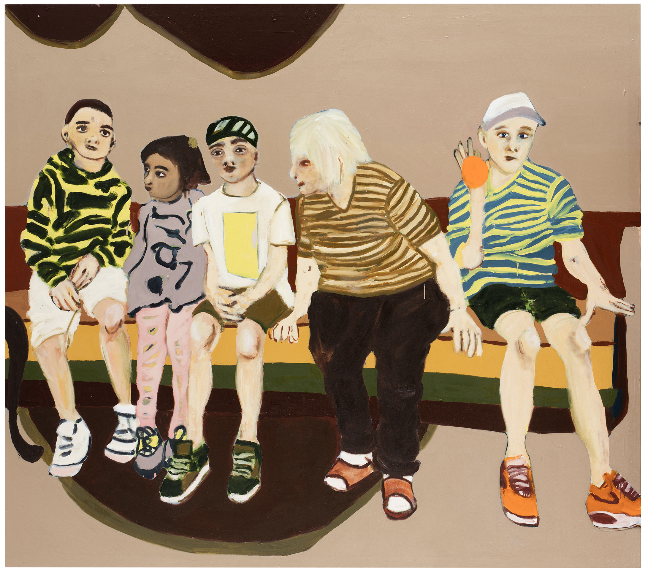 The three-dimensional effect of the works in the exhibition came about in evenly lit, almost shadowless works, stretching the perspective. Using guidelines that split the image surface, Mäkilä creates non-spaces and places, moving closer to and further away from the subject. The paintings hung on the walls are also motifs inside a physical work of art, windows into another painted world. Mäkilä’s characteristic background paint masses overlap, crease and crack like a broken mirror. The relationship between the visual subject matter and the fragmented environment is built up through the impenetrable and open gazes of the main characters. Family members, loved ones, pets, art objects and household items form mutually surprising compositions.